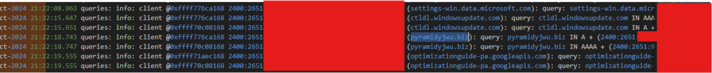 「DNS名前解決ログ残ってるだろうな」と、ログを探しました。