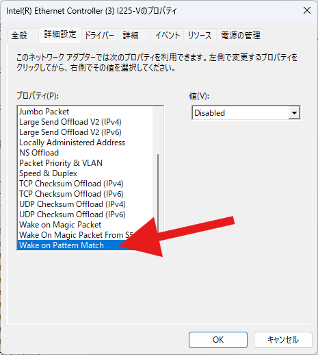 詳細設定タブから、「Wake on Pattern Match」を探し、