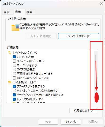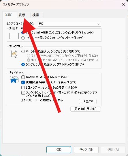 すると、このような「フォルダーオプション」という名前の付いた画面が出てくるはずです。