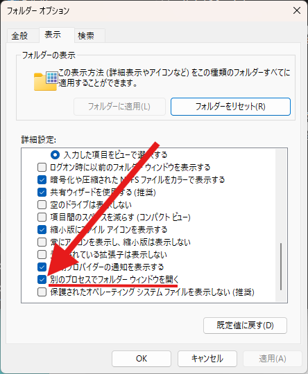 一番下に、「別のプロセスでフォルダーウインドウを開く」という項目があります。